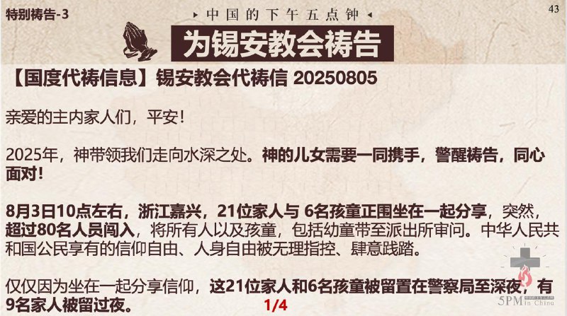中国的下午五点钟,为狱中肢体代祷