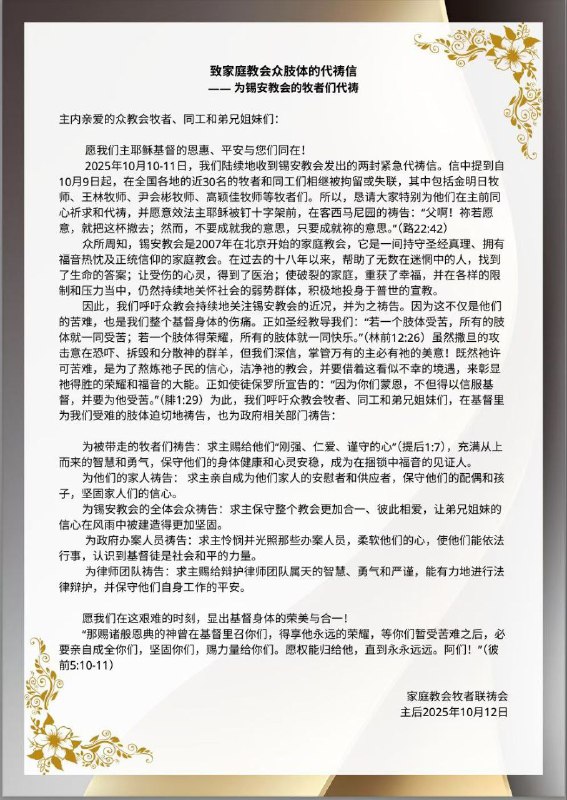 我诚恳地请求大家为北京锡安教会祷告,也为所有被拘押的牧师、教会领袖、财务同工以及神学院教师祷告——他们都是忠心服侍主身体的人。
