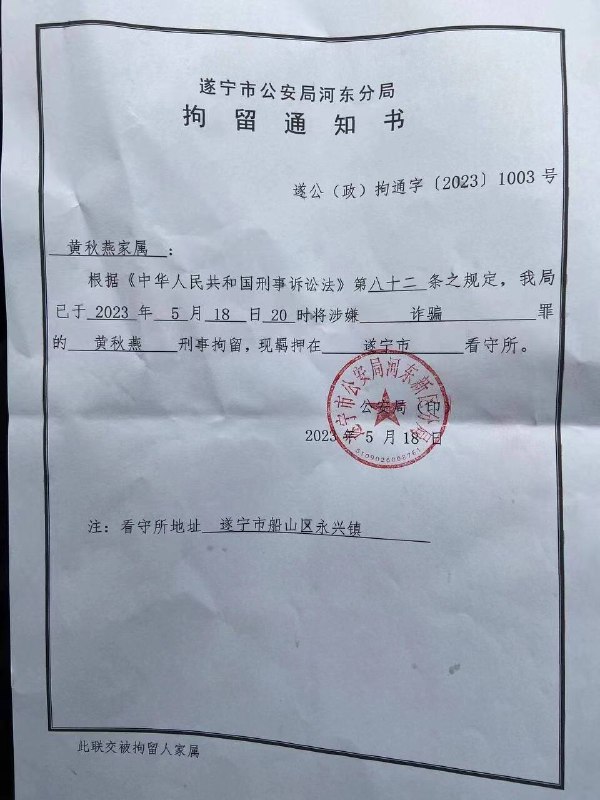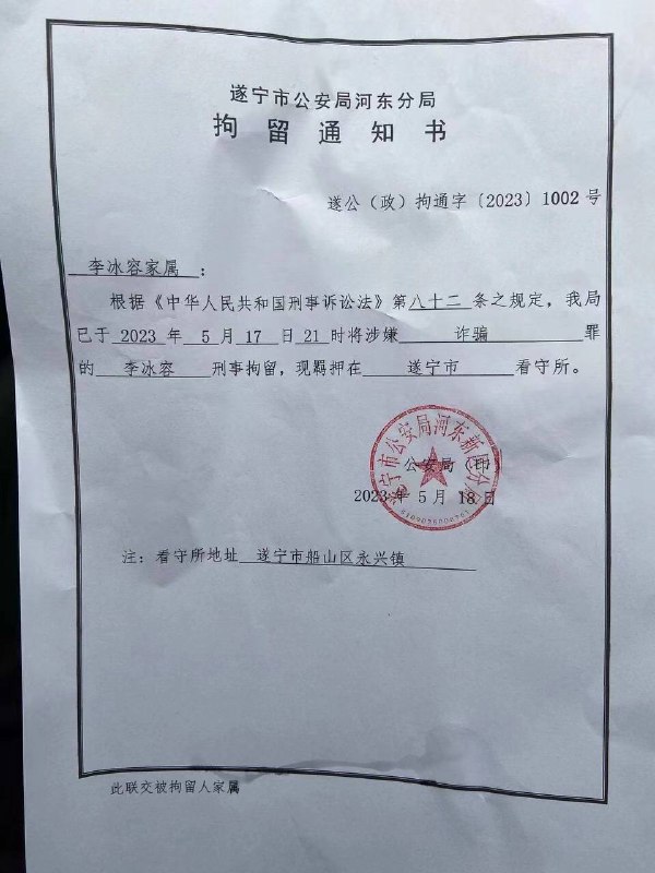 ③李冰容、颉(xié)莉红、黄秋燕。四川遂宁,5.17-18被刑事拘留,诈骗罪。
