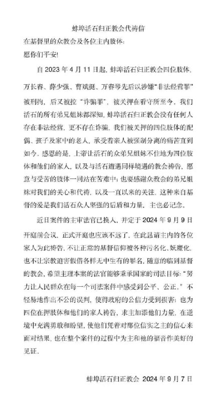 9月1日主日,李英强长老、吴五清传道、晏鸿传道、曾庆涛副执事因为带领教会主日崇拜而被处以行政拘留十四天。