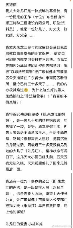 2023年5月24日,盛佳教会的四位同工邓燕祥传道、朱龙江弟兄、王伟才弟兄、朱巧玲姊妹被顺德公安局以涉嫌“非法经营罪”被刑事拘留。目前拘留已超过三十天,家属还未收到批捕书,昨天3位弟兄的妻子都发出了代祷信。
