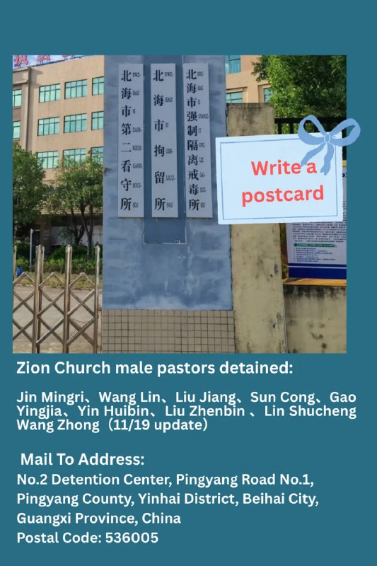 1,以下牧者同工已经转往监狱服刑,未来如果得到准确地址,再分享给大家,请大家寄明信片: