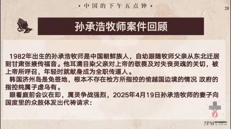 我是甘肃省张掖市孙承浩牧师的妻子金花。我丈夫于2023年12月15日以涉嫌“组织他人偷越国边境罪”被羁押,今天甘州区人民法院发出判决,孙承浩牧师被判刑4年6 个月,并处罚金1万元,刑期至2028年6月15日。