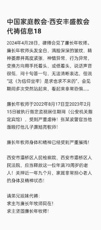 20240430国度祷告会消息(安徽合肥甘泉教会):“...我们教会今天下午去看望周松林牧师妻子魏淑蝶师母,师母现在很刚强喜乐,师母让再为周牧师代祷,师母又请了张凯律师,师母也强调为张凯律师代祷。教会也还好。”—消息来自国度祷告会热心肢体